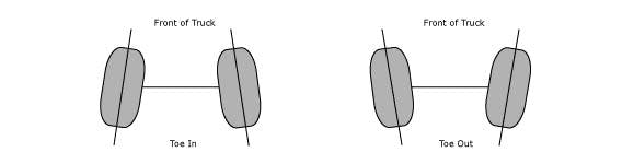 There are three factors which affect a vehicle’s alignment: toe, camber, and caster. Toe is the angle at which the car’s front tires point. Toe can be expressed in either degrees or fractions-of-an-inch. The toe setting is typically used to help compensate for rubber suspension bushing compliance while the car is moving.