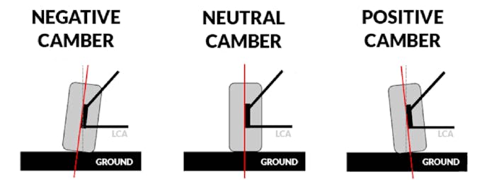 Camber is the amount of angle the top of the tire leans in. This is measured in degrees. If the top of the tire tilts in, the vehicle is experiencing negative camber. A tire that leans outward is experiencing positive camber.