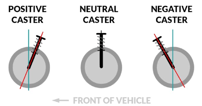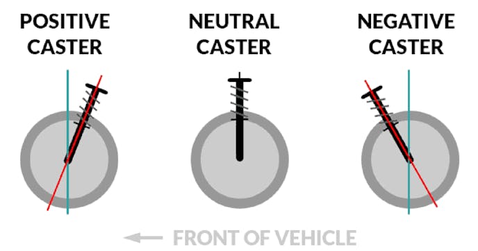 Caster is the angle of the steering pivot. This angle is measured in degrees by comparing an imaginary line (vertical plane) running through the upper and lower ball joints. Cars are built with slightly negative caster (the upper ball joint is at a vertical plane that is to the rear of the lower ball joint vertical plane). If the top of that imaginary line angles toward the rear of the vehicle at the top, this is positive caster. If the line at the top leans forward, this is negative caster.