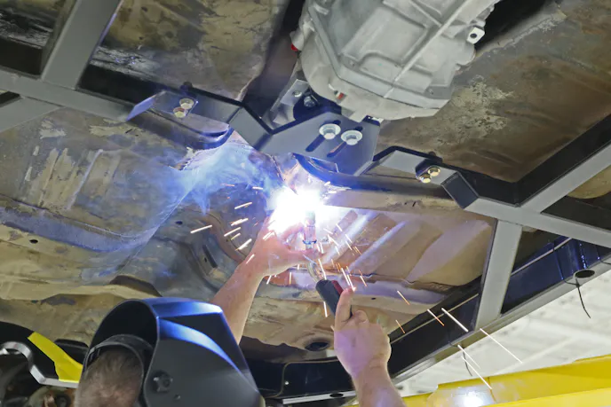 In just a few weeks, QA1 shipped out a 3.2-inch diameter carbon fiber driveshaft and it was up to IPT to make it fit in our very tight tunnel. Keep in mind, the factory driveshaft was smaller in diameter and the frame probably did not sit quite as close to the floorboard. When installing the Schwartz chassis, we custom-made the body mounts out of Delrin and cut them to size. The reason for doing this is that 50-plus years and many hard miles bring the metal out of shape, and the only way to make it truly level is to adjust the thickness of the body mounts. It also gives you the advantage of tucking the frame up further under the body, but of course that affects drivetrain clearance and possibly the driveline angle as well.