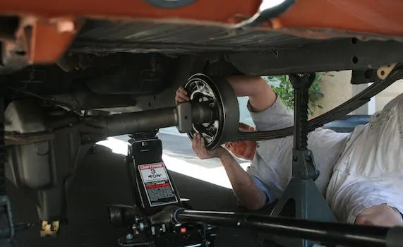 To weasel the big Dana into the Dodge, we slid it length-wise under the body on a Craftsman floorjack, using its dual axis to allow us to lift it up and rotate it enough to allow one drum to be hefted over a leaf spring at a time.