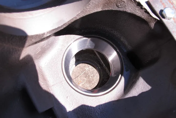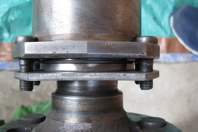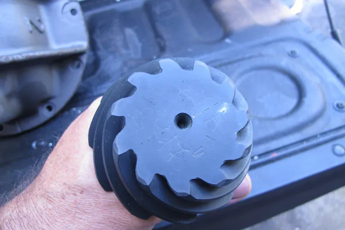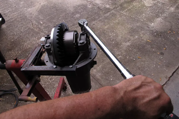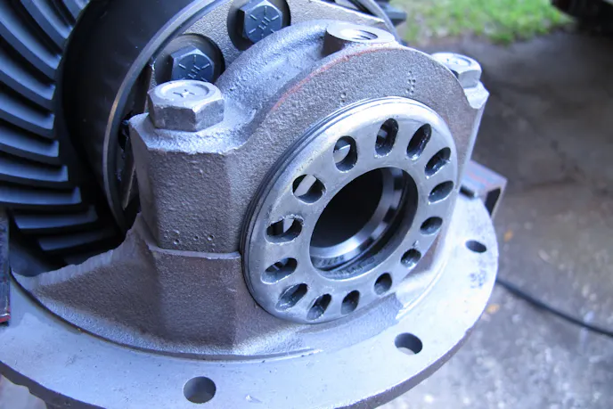 The differential rides on two bearings, one on each side. The bearings (and outer races) are clamped in the housing bores, and threaded adjusters are used to set the backlash. Moving the ring gear closer to or farther from the pinion changes the backlash. The adjusters can be threaded in and out of the housing to provide for side-to-side travel. While a spanner wrench is recommended to turn the adjusters, I didn’t have one. I used a stiff pair of needle-nose pliers.
