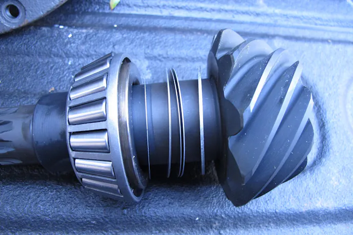 The first step is to set pinion depth. This is the most difficult portion of a gear change. Ring-and-pinion gears are designed to have a precise “mesh” between the ring gear and the pinion gear. The ring gear rides on the centerline of the differential’s bearings and its depth is not adjustable. For that reason, the position of the pinion gear, as is located in the case, is designed to be adjustable. To adjust pinion depth, shims are placed between the large inner pinion bearing and the pinion gear. Adding shims decreases pinion depth (moves pinion closer to ring gear) while removing shim increases depth (moves pinion away).