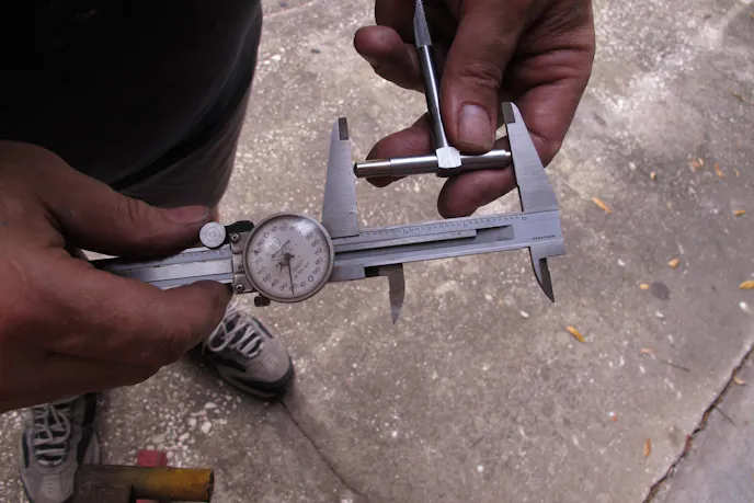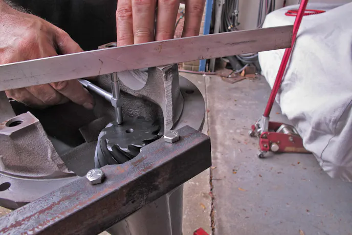 To know if pinion depth is correct, pinion-setting tools are typically used. I don’t have that special tool. To find pinion depth, I use a piece of 3/4-inch aluminum angle iron, a snap gauge, and a set of veneer calipers. While it’s not as fancy as the special tool, it works. To determine the required shim thickness, I installed the inner bearing with .040-inch of shims to start and then installed the pinion and measured the distance. I needed a little more depth (another .010-inch). Since the shims come in various thicknesses, I switched the shims around to get the desired thickness. Unless you’re extremely lucky, the pinion may need to be removed and installed several times until it’s correct.