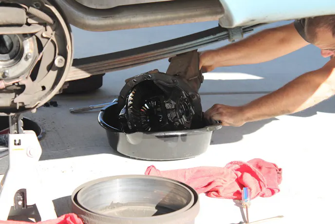 We raised the car for access to the differential and supported the axle housing with an additional pair of jack stands, always keeping safety in mind as a key element to any driveway installation. After draining the old fluid, we first removed the nuts holding the drop-out differential in place and worked it loose.