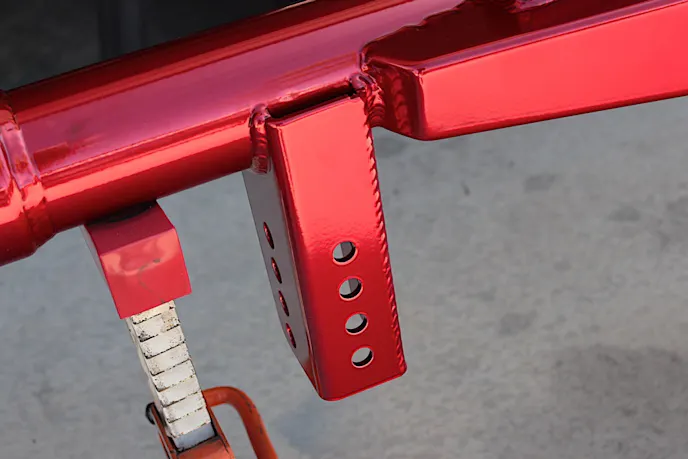 The front link bracket is a solid, formed piece that is aligned to the frame rail and perimeter-welded in place. So it was time to break out our Millermatic 252 welder and get to work. We began by prepping the surface to remove dirt and surface rust, and using the bracket as a template and marking the mounting location.