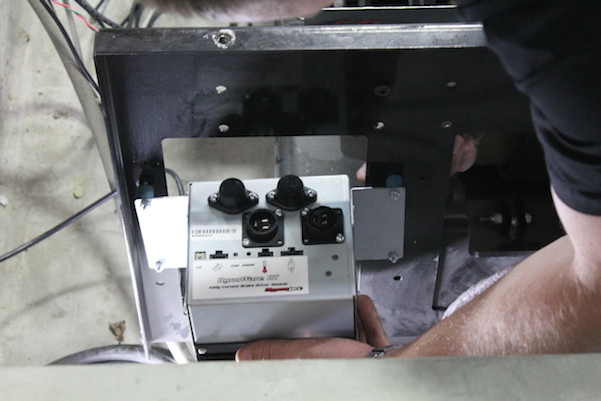 Disconnect the power supply. “I cannot stress this enough,” said Chastain, “First thing that you always need to do is disconnect the power supply.” From there, removing the Eddy Current brake pit cover is simply a matter of removing seven machine bolts that secure the panel to the dyno-pit. Once the seven bolts are removed, the panel can be lifted up and out of the way, exposing the Eddy Current brake and load controller.