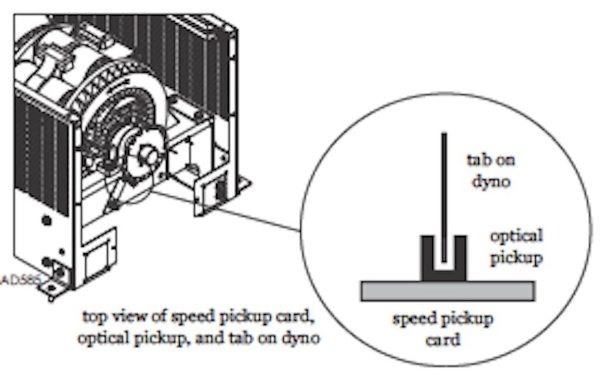 Install the 16-tooth speed pickup disk onto the Eddy current brake shaft and lightly tighten the machine screws that secure the disk to the brake shaft. The new speed pickup card can then be installed on the on the bracket with the two 8-32 screws.