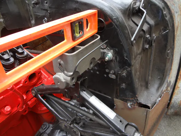 The addition to the bracket can be fabricated from some 1 1/2 -inch flat stock. The front of it will need to be the same pattern as the master cylinder. To get this pattern, get a piece of thin cardboard and scribe a mark around the mounting end of the master cylinder.