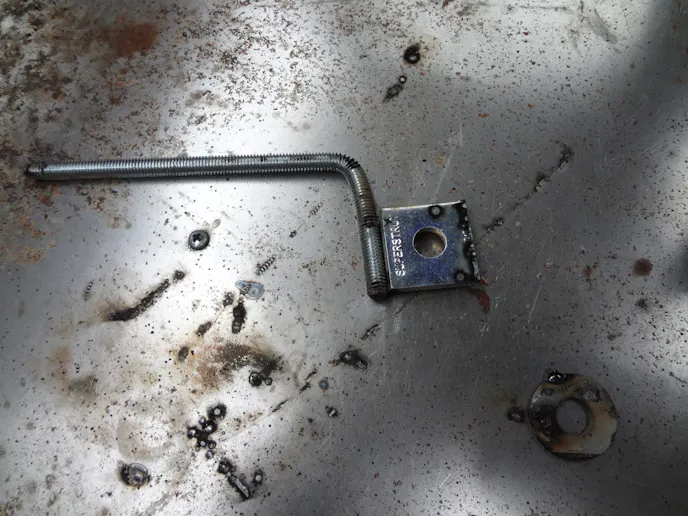 The pedal pad can be from the section you cut off or you can make something clever. The pedal bar will probably already have a plunger rod hole for mounting but in the case it doesn’t line up, booring a new hole will be fairly easy. If you got a plunger with the assembly when you bought it, that would be ideal. If not, it’s not a big deal. You can make one from a #8 bolt the same diameter as the plunger.