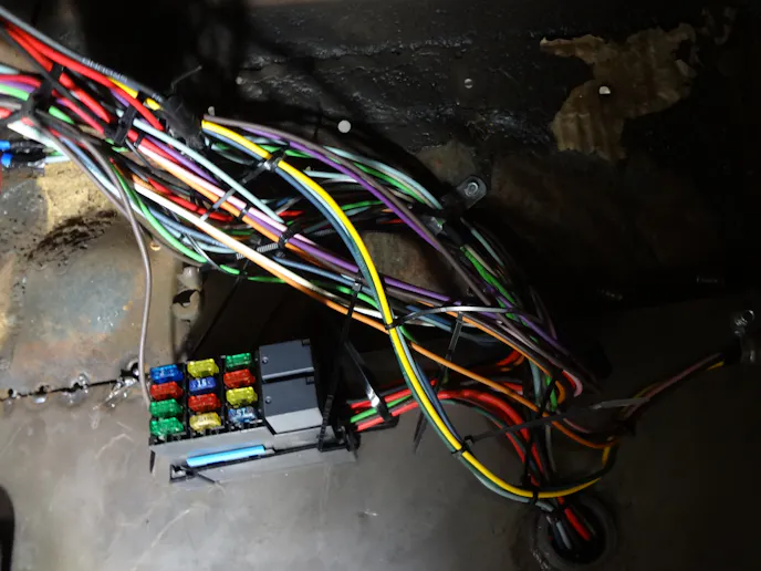The next-easiest section to tackle will be the front section. There will be several more wires to contend with but nothing like the interior. Find the least congested place to drill your hole through the firewall (on the passenger side if possible.) If you tape the wires together about every 2 feet, it will make your life easier when pulling them through the hole.This is particularly true if your running a Chevy drive train. Most of your hookups will be on this side.