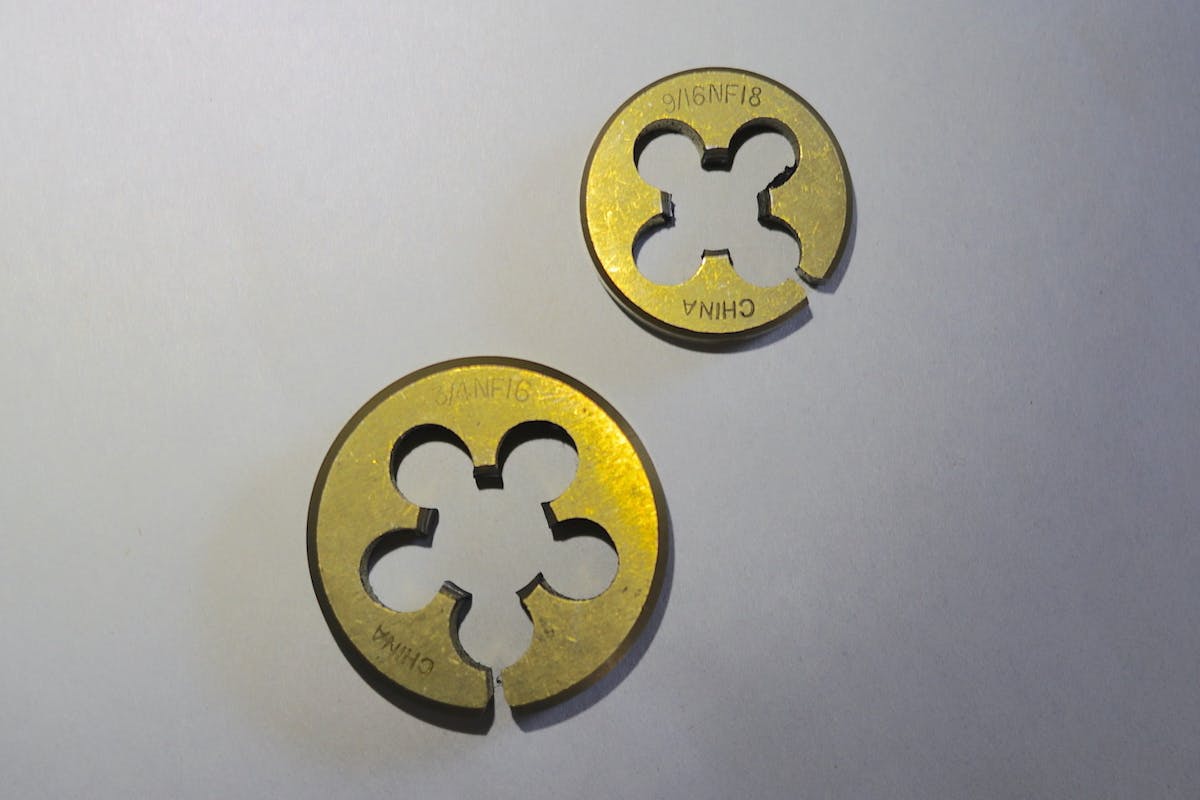 Thread cutting involves using one or more cutting points to remove material from a rod or wife to create threads. Most home mechanics either own or have used a simple tap and die set with cutting dies like these. This is a low-cost method of putting threads a bolt.