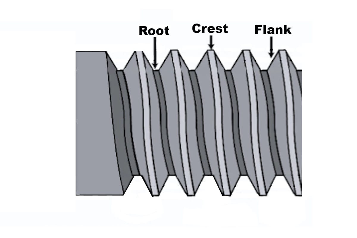 When you look at a bolt from the side, you get a profile view that shows several details of the bolt’s threads. At the top of each thread is a crest. From the crest, a flank runs down toward the center of the bolt on either side and these flanks meet at the root of the thread.