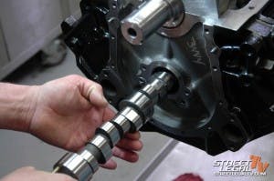 With the short block together, it was time to stab in the cam, a COMP Xtreme Energy hydraulic roller unit featuring .540/.560 lift and 242/248 degree duration at .050, with a 110-degree lobe separation angle. The aggressive lobe profiles on COMP’s Xtreme Energy series cams are designed for better throttle response and more high-end power than a typical cam sharing the same specs, without killing idle vacuum. COMP’s Trent Goodwin explains, “The shorter seat timing and quicker lobe designs on our Xtreme Energy cams create more low-end torque to help move the heavier mass,” which is exactly what we’re looking for.