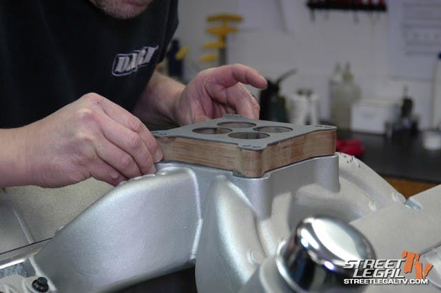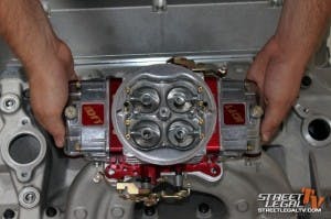 Now that they finally had a place to put it, a Quick Fuel Q-850 carb and one-inch tall phenolic “cloverleaf” spacer topped off the intake manifold. The Q-850 is a 4150-style carburetor with a Proform aluminum main body, CNC-machined billet metering blocks, and a billet throttle baseplate, which is far less likely to warp or break an ear than a conventional cast baseplate.