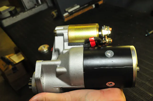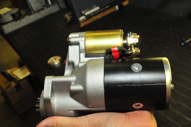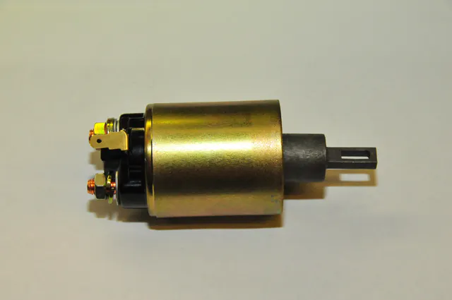 The solenoid contains several modifications to provide efficient performance racers expect. For instance the solenoid plunger (the black cylinder on the right) is chamfered to assure that the in-and-out movement will not bind. The free movement of the plunger is mandatory for reliable starting.