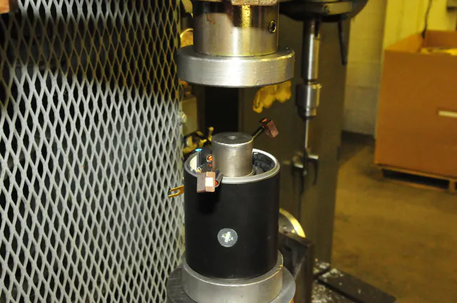 The reverse rotation coil is now put in place. This procedure is an exacting process that requires great precision. Once the coil is placed in the housing, it is then pressed outward to assure a tailored fit and provide the required clearance for armature rotation.