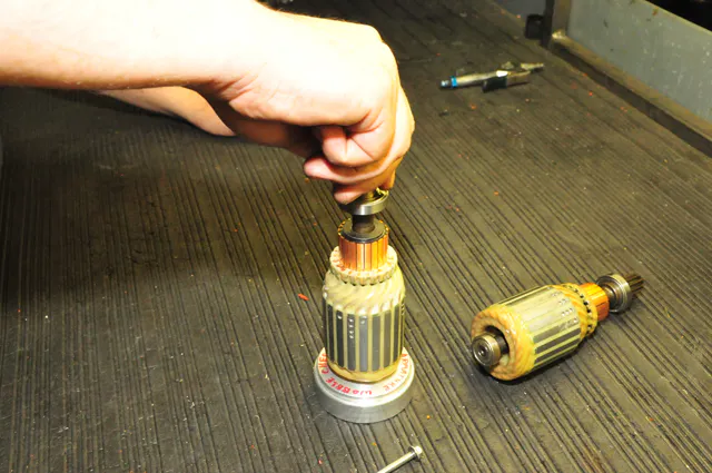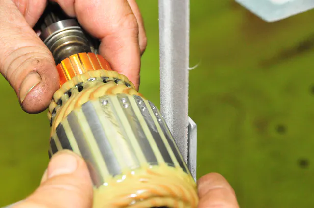 Because the armature and bearings unit is the heart of a starter, it’s important that each unit is verified for free rotational movement. Unrestricted rotation is vital for efficient and long operation. Should any vibration, wobble or other movement impediment be detected, the unit does not pass inspection and is discarded.