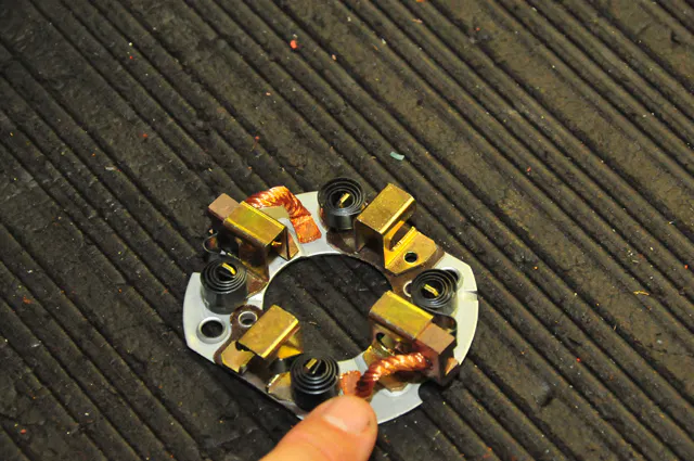 Each armature brush unit is modified to assure that there is no electric arcing that could cause operational failure. Here, the copper wiring has been elevated from the base of the brush unit. This small but important step ensures that no contact of electricity will occur to the base.
