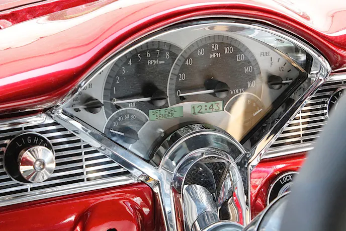 We recently installed a VHX-55C instrument cluster into a fresh, frame-off 1956 Chevrolet Bel Air restomod. In addition to the VHX, we also added the matching VLC analog clock to fill in the opening on the right side of the dash on the Bel Air.