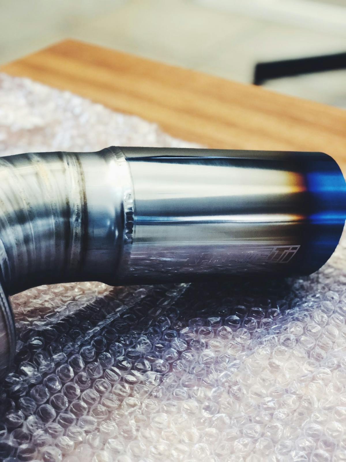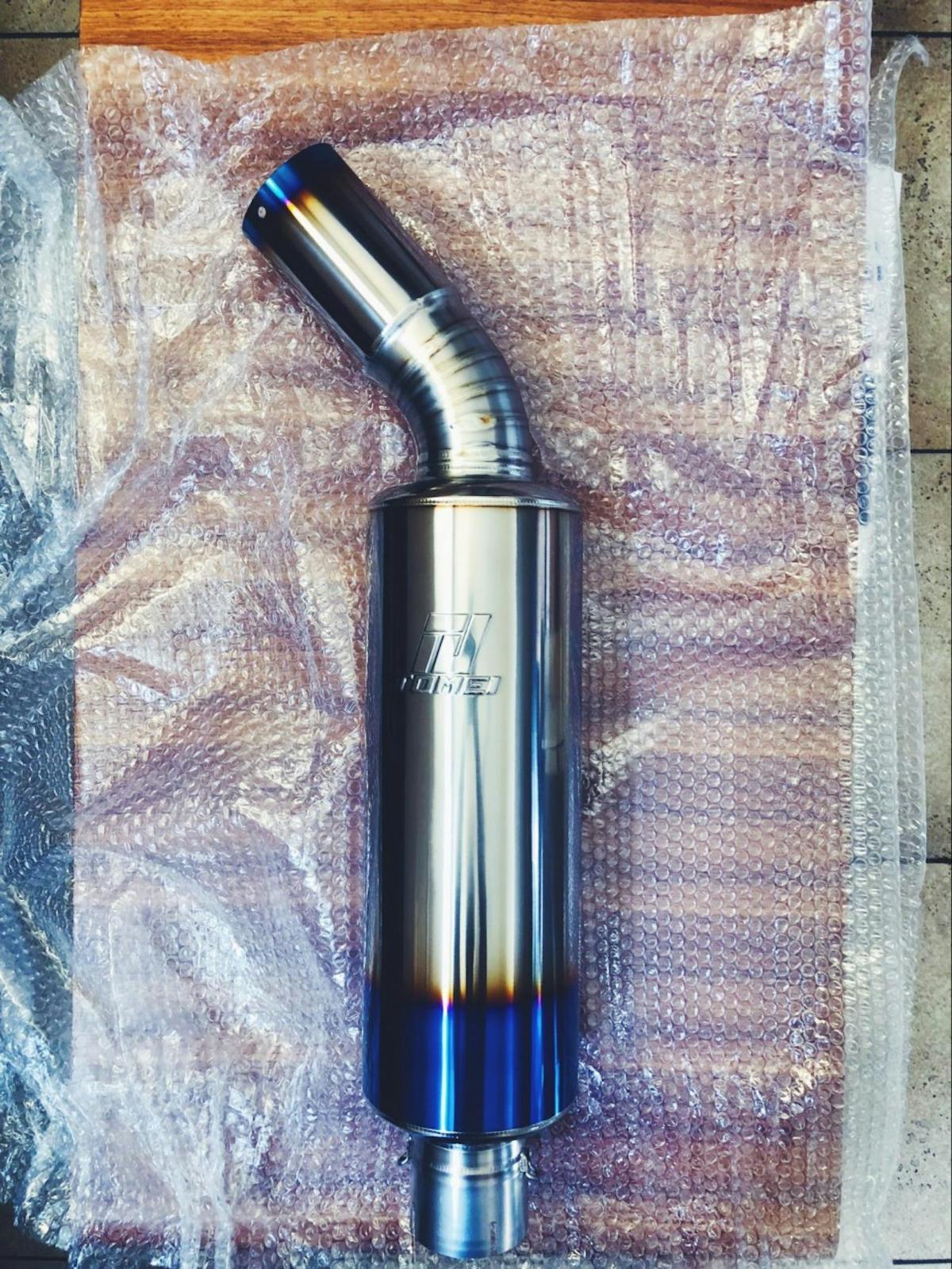 I carefully cut the packing tape that holds the bubble wrap together to reveal the perfection that lays hidden behind the wrap. Robotic welds, something you only see at Full-Race Motorsports, have made their mark on Tomei’s titanium piping. The main section weights no more than two pounds. You can seriously bench press this thing with your pinky! After getting a taste of what to expect, I go straight for the muffler.