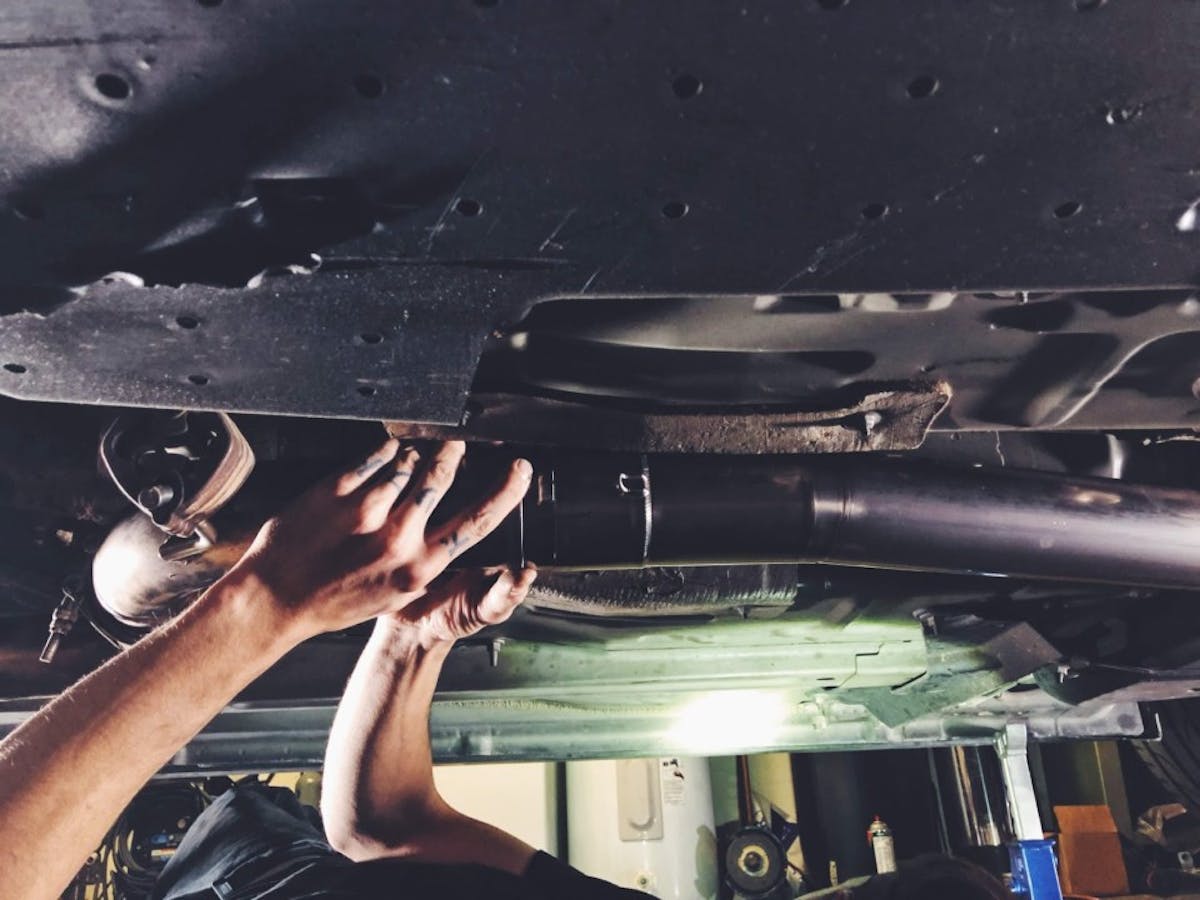 In less than 10 minutes, Devin had the mid-elbow hung from the stock hanger and attached the main pipe; he used a jack stand to help support the pipes. I wrapped the muffler in towels as I handed it to Devin to hang on the rear hanger near the rear bumper. He slid all the pipes in place and began adjusting the height.