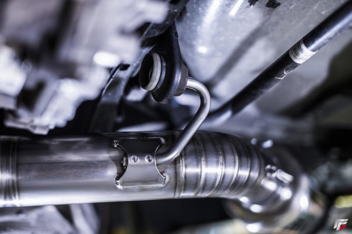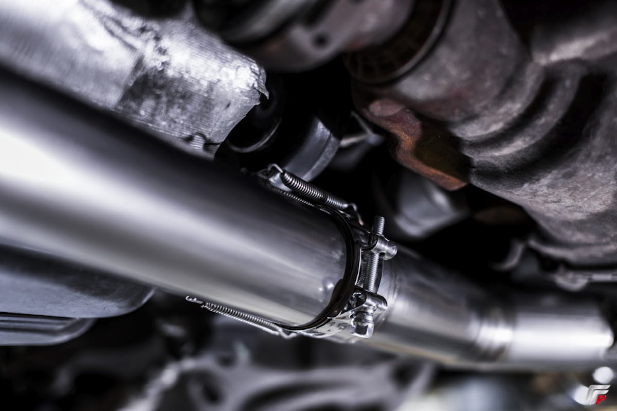 I start by removing the rear section of my Full-Race Motorsports exhaust, from there, I work my way forward and loosen the front compression clamp to remove the entire system. If you have an OEM exhaust, remove the compression clamp from the downpipe connecting the resonator. Remove the two hangers bolted to the rear subframe. Have a friend go to the front, push the exhaust forward to remove the slip from the downpipe.