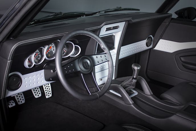 The cockpit-style cluster features individual gauges, but to fit the allotted space, all but the tachometer needed to overlap on one edge. Tucker also wanted room for high-beam and turn-signal indicators, as well as icons such as shift, check engine, and brake warning lights. Classic Instruments worked with Detroit Speed to ensure function didn’t take a backseat to form. This included making sure Adams had a full view of the gauges in a normal seating and tilt-steering wheel position.