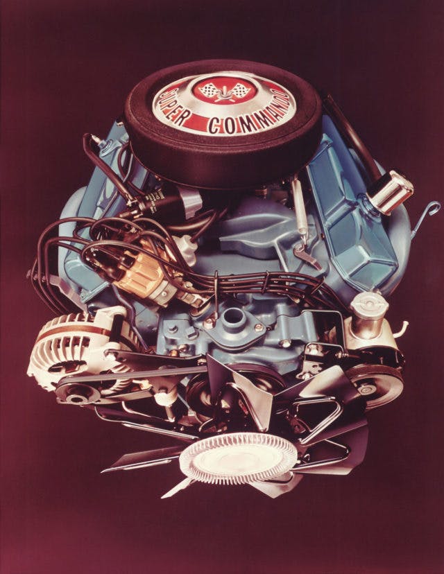 With a pancake-sized bore of 4.32-inch and a stroke of 3.75-inch the 440 could pump out 385 hp and a stump-pulling 490 lb-ft in “Six-Pack” configuration consisting of three 2bbl Holley Carbs and a 10.3:1 compression ratio.
