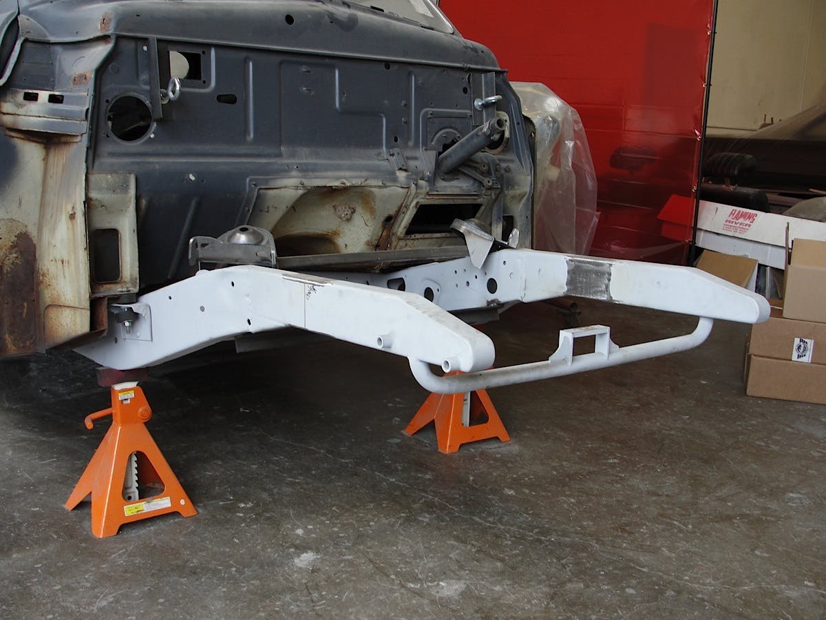 The Ford truck crossmember has a 57-inch track width which will require wheels with additional backspacing to be used to clear the fenders. A narrower crossmember can be installed if you desire to use wide wheels.