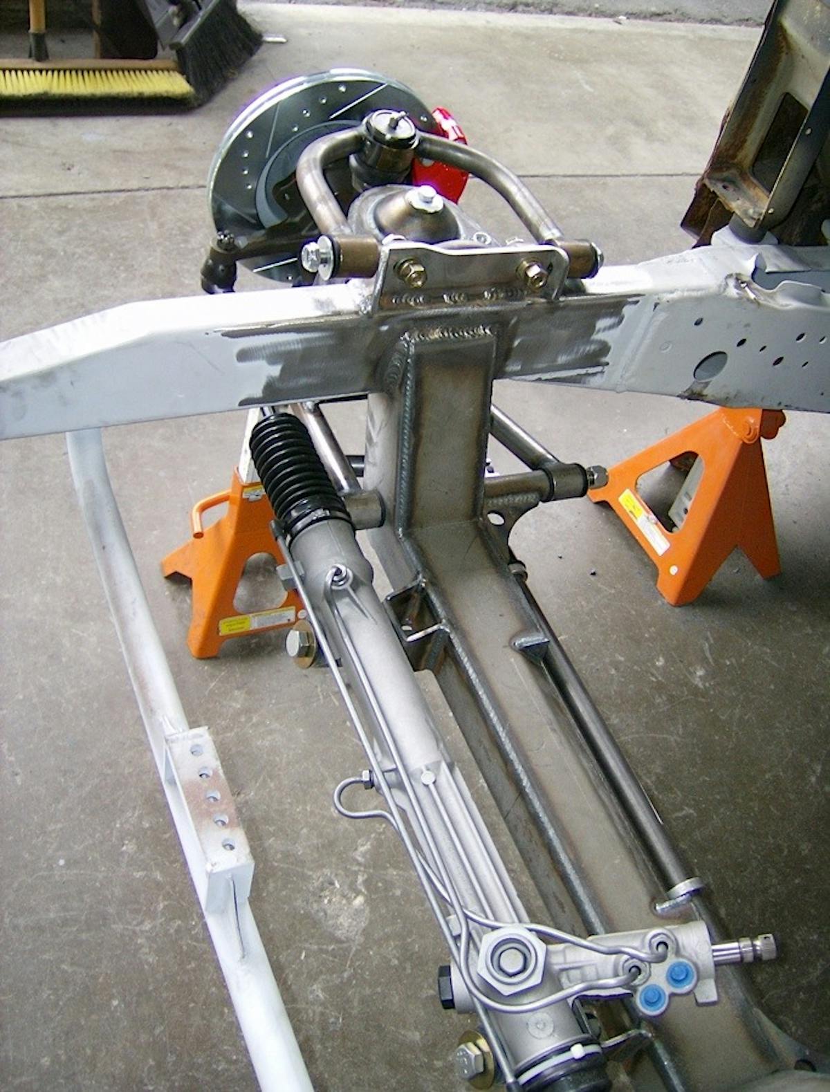 As seen below, mounting the rack and pinion steering forward of the crossmember creates a generous amount of header room, access to the stock oil filter location, and a straight shot for the steering column and linkage.