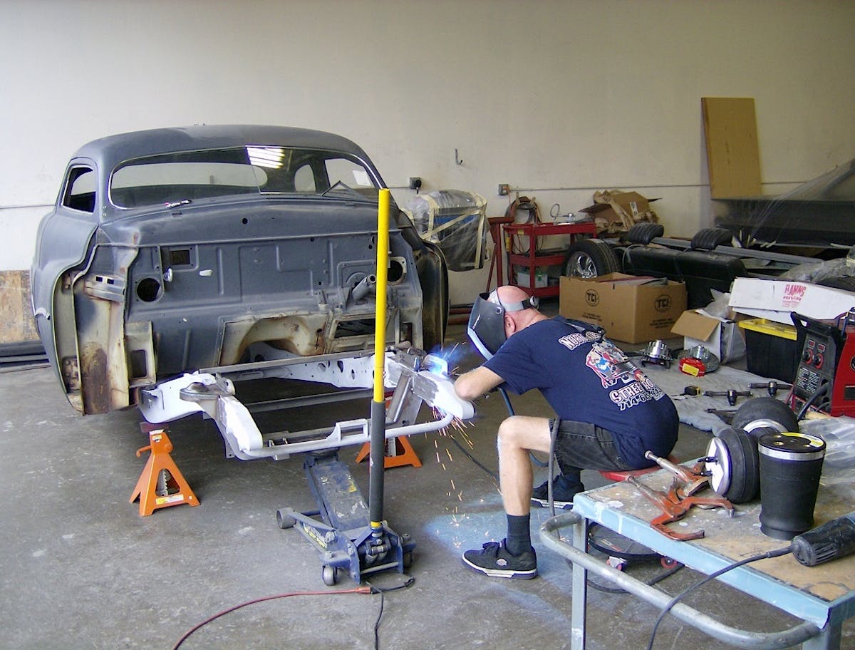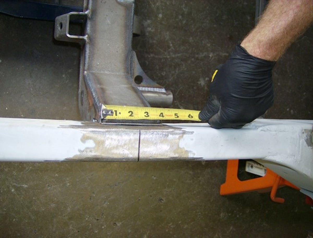 The 1951 Mercury depicted in this installation features a 118-inch wheel base. Few fabricators have a steel work table large enough to retain this chassis and instead rely upon level, smooth concrete to ensure the stock chassis remains flat and square during modification. Be advised you should mark the concrete floor using a plumb bob to establish the replacement front axle location before making any cuts to the chassis. Also, weld temporary braces to ensure the stock frame rails do not spread or twist while the stock chassis snout is removed!