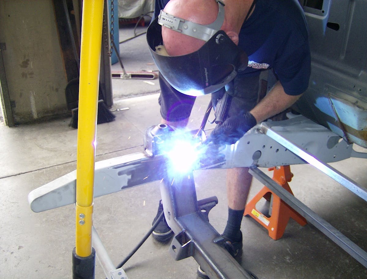 Now that the front suspension has been test fit, along with mounting the wheels to ensure proper turning radius, the crossmember and spring hats are permanently MIG welded into place.