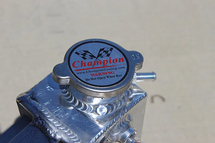 The swap to the Champion radiator was a quick and easy swap, taking less than an hour to remove the old copper unit and bolt the aluminum unit into place. One advantage that Ed noticed was that now he has a brass petcock where the old method was to simply disconnect the lower hose and let it all flow out.