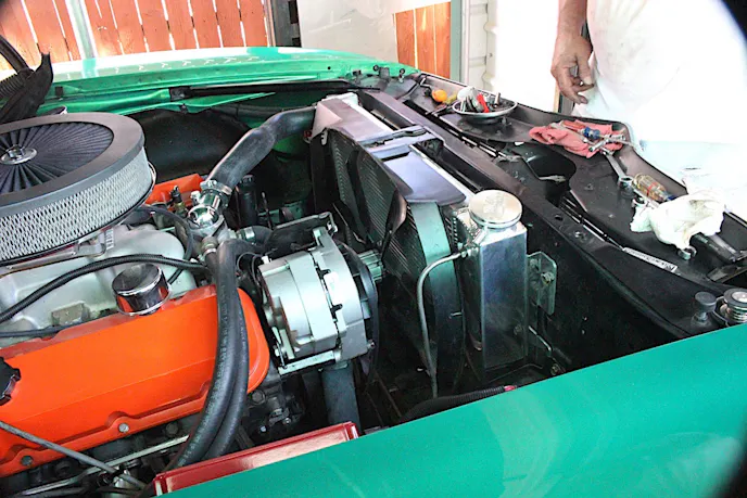 The LS-style radiator is a double pass design, which means the coolant passes through the radiator twice, which does help to keep the engine cooler. It’s not necessarily only for LS swaps; and with the early F-body radiators that we brought with us for test fitting, the Double Pass was pretty close to working on the BBC in this ’67 Firebird. The large, OE alternator was just a little too close for comfort, so Ed decided to go with the conventional style radiator.