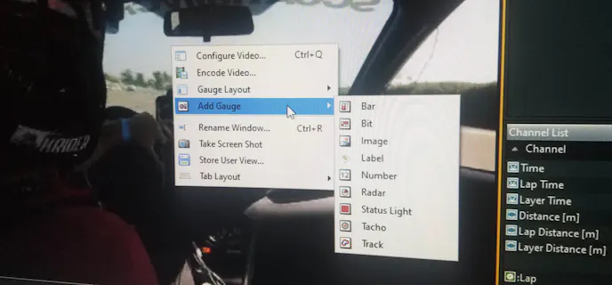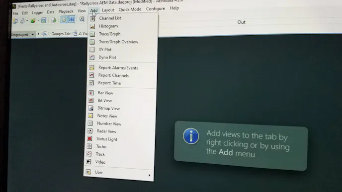 Once you have a log to work with from the AEM Digital Dash, you won’t see anything interesting on the screen. You will need to go to the top of the menu bar, select “Add” and then in the drop down menu select “Channels.” This will show you all of the different channels which were logged during your time at the track. We use the engine speed channel to show RPM. This “Add” option will also allow you to add a track map and a video screen.