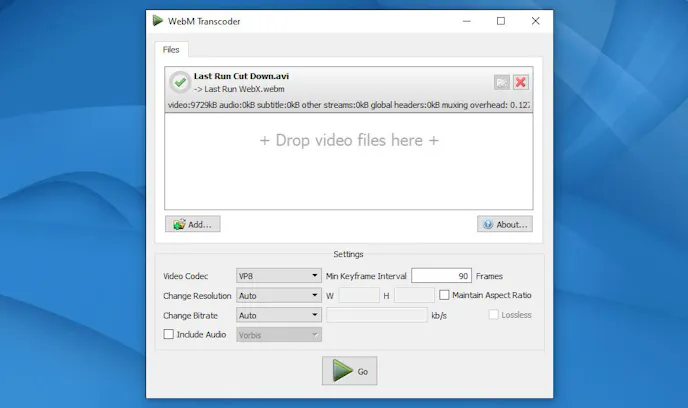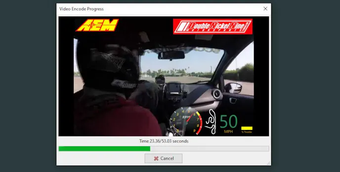 The video file has to be converted from whatever it originally started as from the camera – MP4, WMV, AVI, etc. – to a WEBM file. Using the WebM Transcoder software it simply converts digital video files to WEBM files so the AEM Data program can use them. This can be a time consuming process, so have some patience (it may take up to 30 minutes). Pro tip: edit your total video down to just what you want (like a single lap) to shorten up this process.
