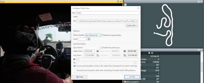Once your video is converted to WEBM you can add a video screen and you will see your video displayed in the software. On our screen we have three things added: Channel, Track, and Video. By hitting the play button at the top of the screen you will see all three screens move according to the data. You will see the engine data start to move (RPM go up), you will see the white ball on the track map begin to move (GPS data), and you will see the video play. Right away you will realize the video and the GPS/engine data are probably out of sync.