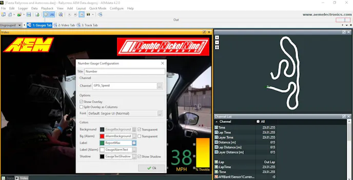 Adding different types of gauges over your video is extremely easy with the AEM Data software. By simply scrolling your mouse over the video, right click, then select Add Gauge, which gives you an additional drop down menu with lots of choices. The options here are pretty limitless. It is in this “Add Gauge” section where you can add a team logo (we added ours for Team Double Nickel Nine Motorsports) by adding an Image. We added a bar graph to show throttle percentage. We added a track map to show where we are on track during a lap. We added a tachometer to show engine speed. We also added a number gauge to show vehicle speed.