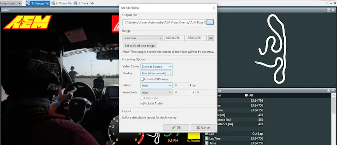 The whole point of all this work is to end up with a cool video at the end. So, after you have your video synched with your data and you have all the gauges you want to see overlaid on your video it is time to encode the video so you can watch it on the big screen. Right click on the video and choose Encode Video. I choose Best Quality and I choose to only render the section of video I want to see (not the entire file from my GoPro). Nobody needs to see me idling in the pits for five minutes. Boring stuff.