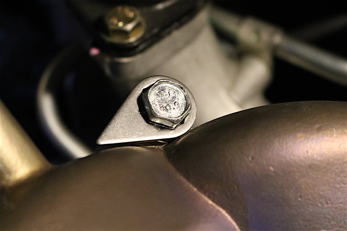 Left: After the bolt was torqued, the locking retainer didn't line up with the header tube to lock the bolt into place. Right: Simply flipping the retainer over changed the position of it and now it sits up against the header tube. This was done without putting a socket to the bolt, it stayed in the exact same spot.