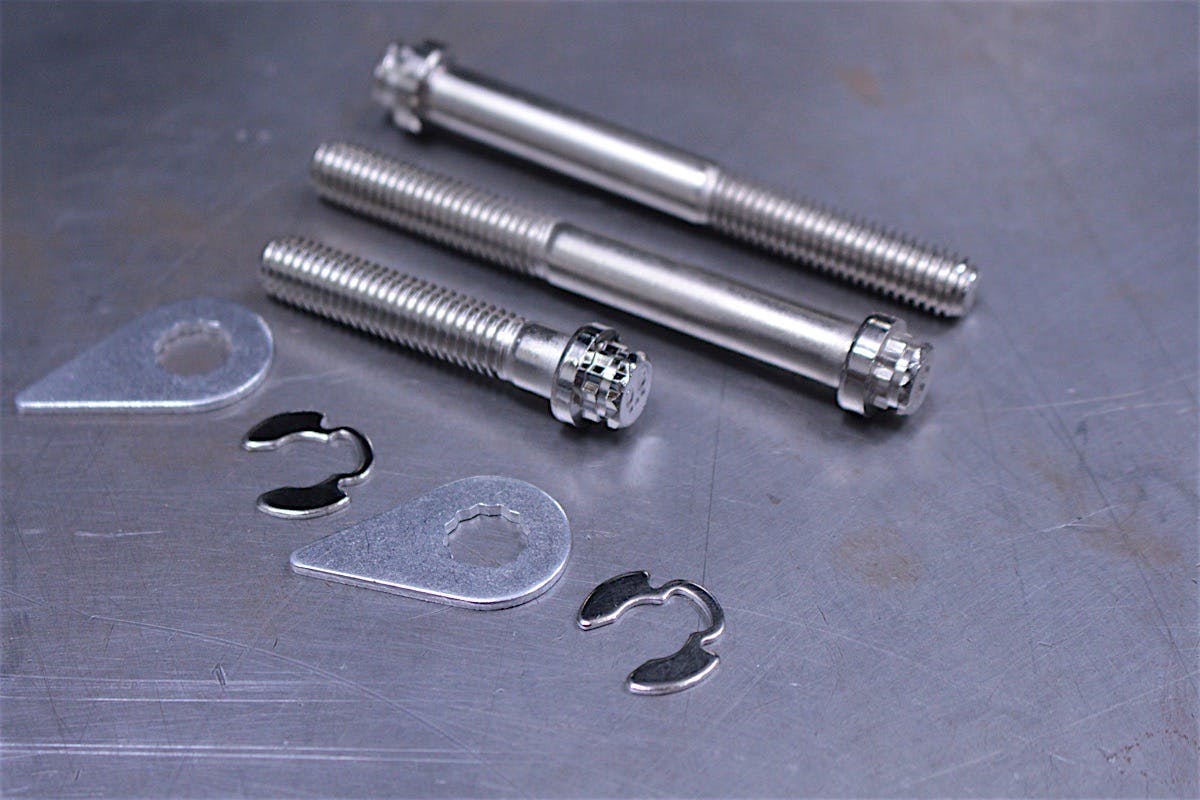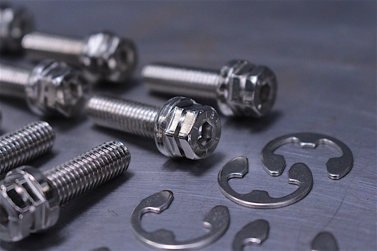 The bolts install like typical hardware, but they have a unique groove on the head of the bolt. With the bolt torqued to specification, a locking retainer is slipped over the head of the bolt and an external E-clip is snapped into the groove. The retainer rests against any fixed part of the engine to keep the bolt from turning.