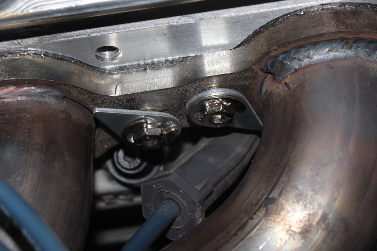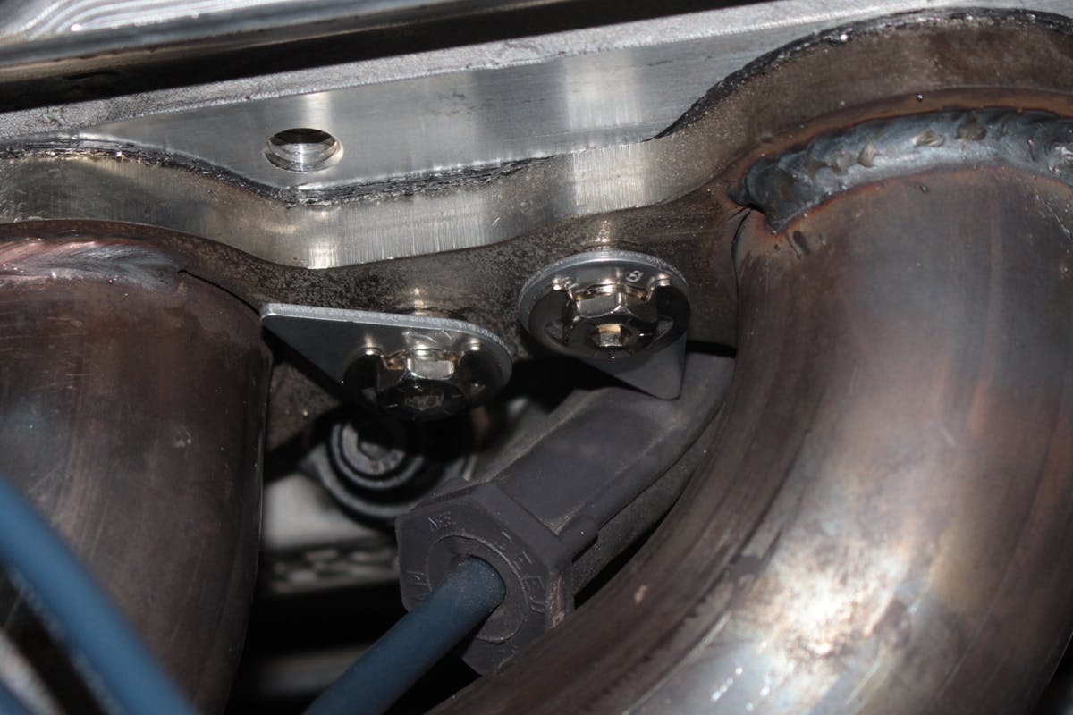 The retainer should be positioned so that it’s touching a fixed spot on the header flange, engine, or other component. If the retainer cannot be rotated enough, simply flip it over and try the opposite side. The bolt can be turned a little further accommodate installation, and once the retainer is installed, the E-clip locks everything into place.