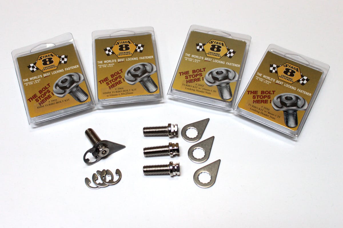 Turbo bolts are notorious for loosening up with all the underhood heat and vibrations. Stage 8 Fasteners replaces the original fasteners with its locking retainers and bolts to lock them into place.