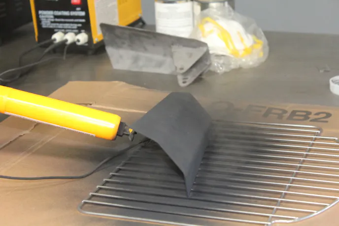 Finally! The easiest and most satisfying part of the process: Laying the spray (putting the dry powder on the part). Hang or lay the part to be coated on a rack or surface that is suitable. A couple of keys to success in coating the part is to make sure the rack is well grounded to the part to be coated. This will aid in proper coverage on the part if you are using the rack or the hook as the ground.