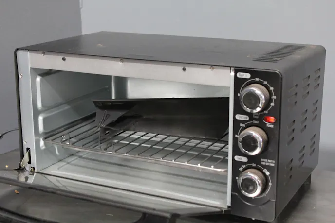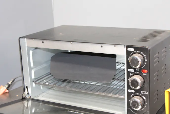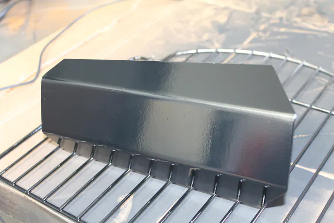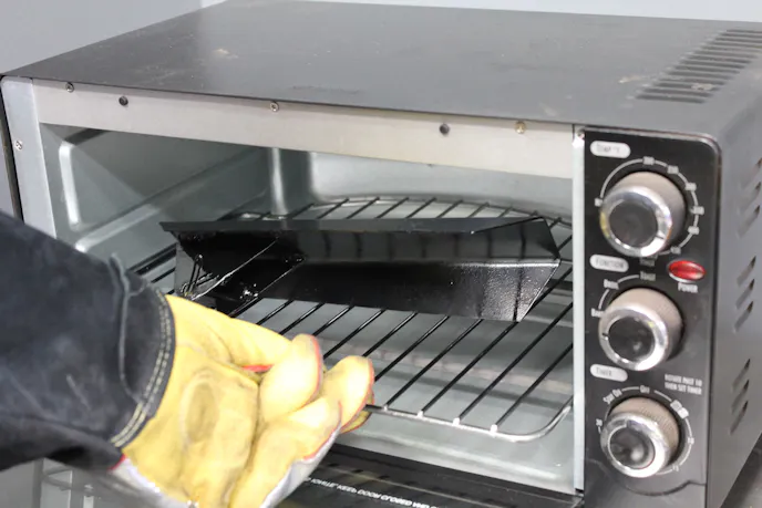 The powder coating should melt into a smooth, even finish over the part. Larger parts may take extra time, but our small oven limited the size of parts we could bake. When the coating is cured, the oven can be turned off and the part removed from the heat to cool down.