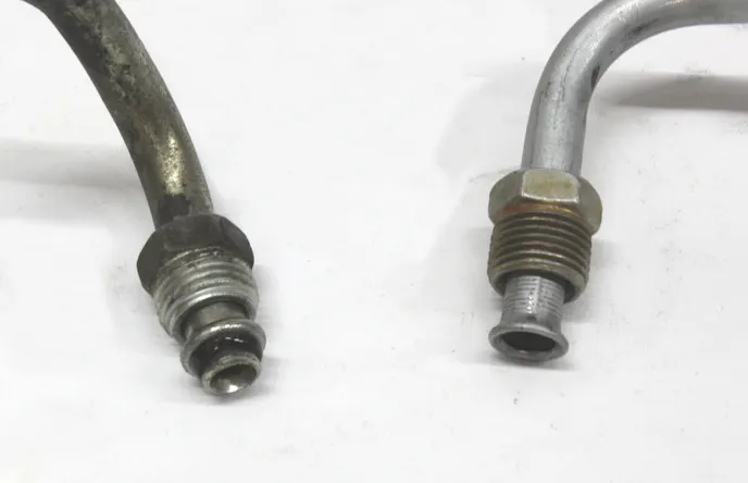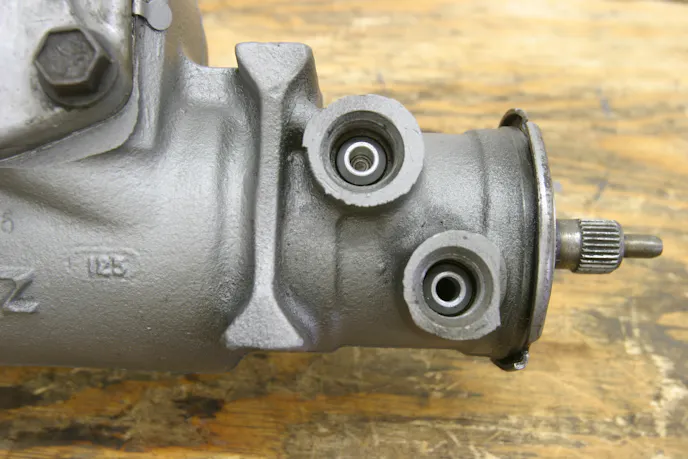 Newer Saginaw steering boxes used what is called an O-ring or Saginaw fitting (left) while older versions use inverted flare fittings (right). Lee sells a simple kit with inverted flare inserts that are easily pressed into late model boxes to allow using inverted flare fittings in later boxes.