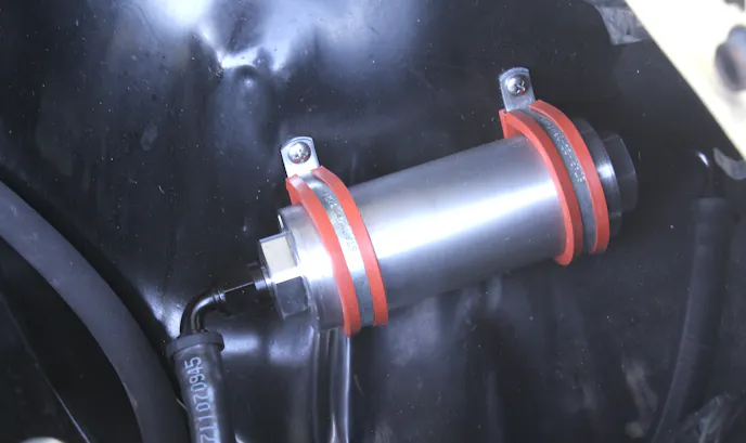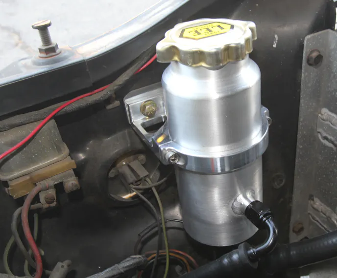 A remote reservoir like this one mounted on the radiator support not only adds capacity, but the reservoir design removes trapped air from the fluid and also contributes to cooler fluid temperatures.
