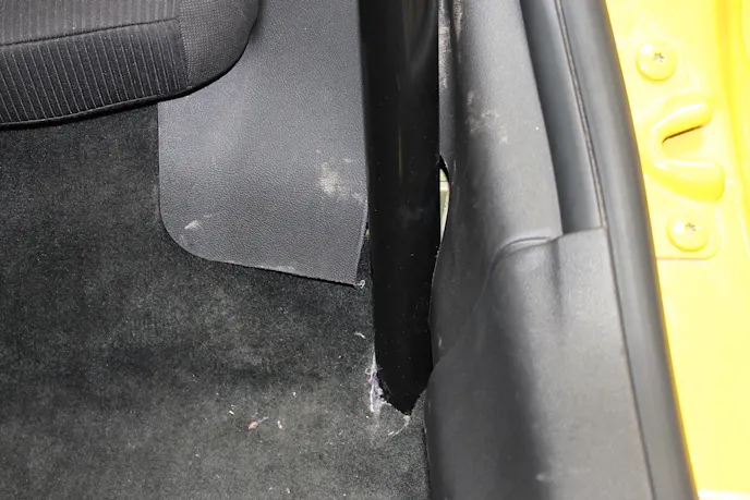 The last steps to finishing up the roll cage were to get the carpet to fit around the B-pillar tube that comes up from the floor, and to notch the plastic door sill piece. To do this, we simply laid the carpet around the tube and cut the carpet to fit around it. For the plastic doorsill pieces, we simply notched them to fit around the tubes.