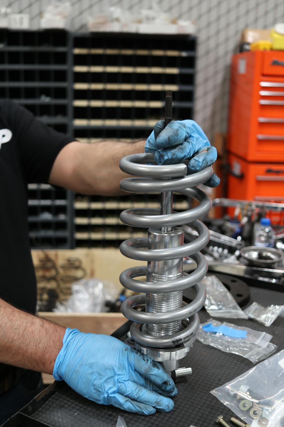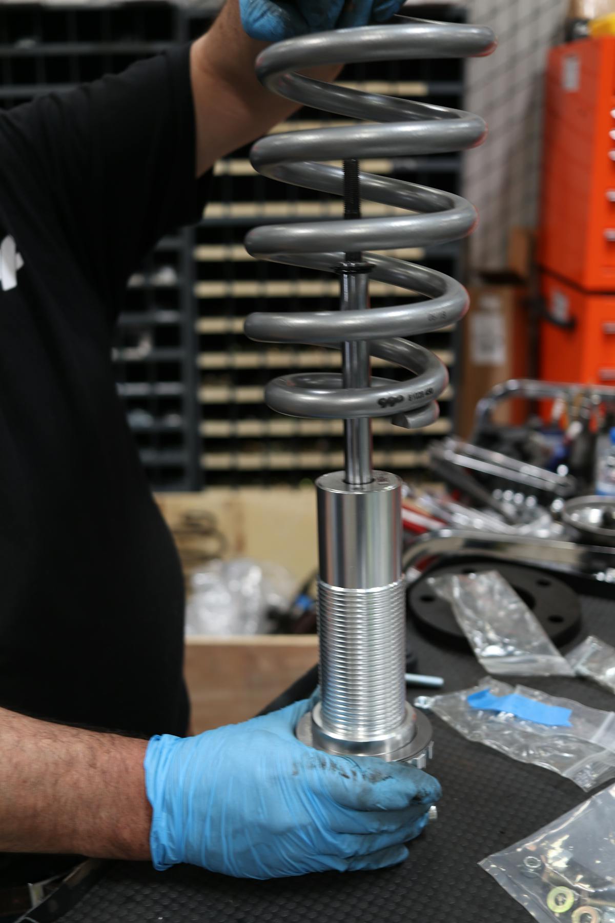 Once the coilover were assembled, the team made quick work of installing them into the pockets on the frame and control arm. You can see the shock and rebound adjustment knobs just under the height adjustment.